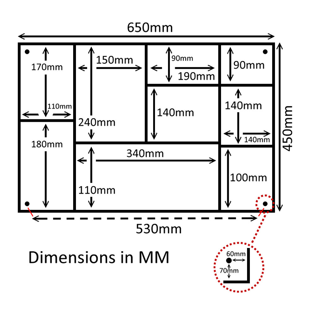 • External Dimensions: 450mm height x 650mm width x 130mm depth