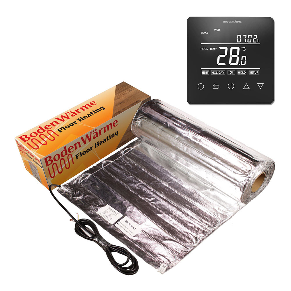 The BodenWärme 2m² Electric Underwood Heating Kit ensures even warmth for laminate and floating engineered wood floors, eliminating hot and cold spots common with radiators. The ultra-thin 1mm dual-core wire minimises floor height increase, while fluoropolymer insulation and an aluminium mat provide fantastic durability. Operating at AC230V +/-10% 50/60Hz, it delivers efficient year-round comfort.