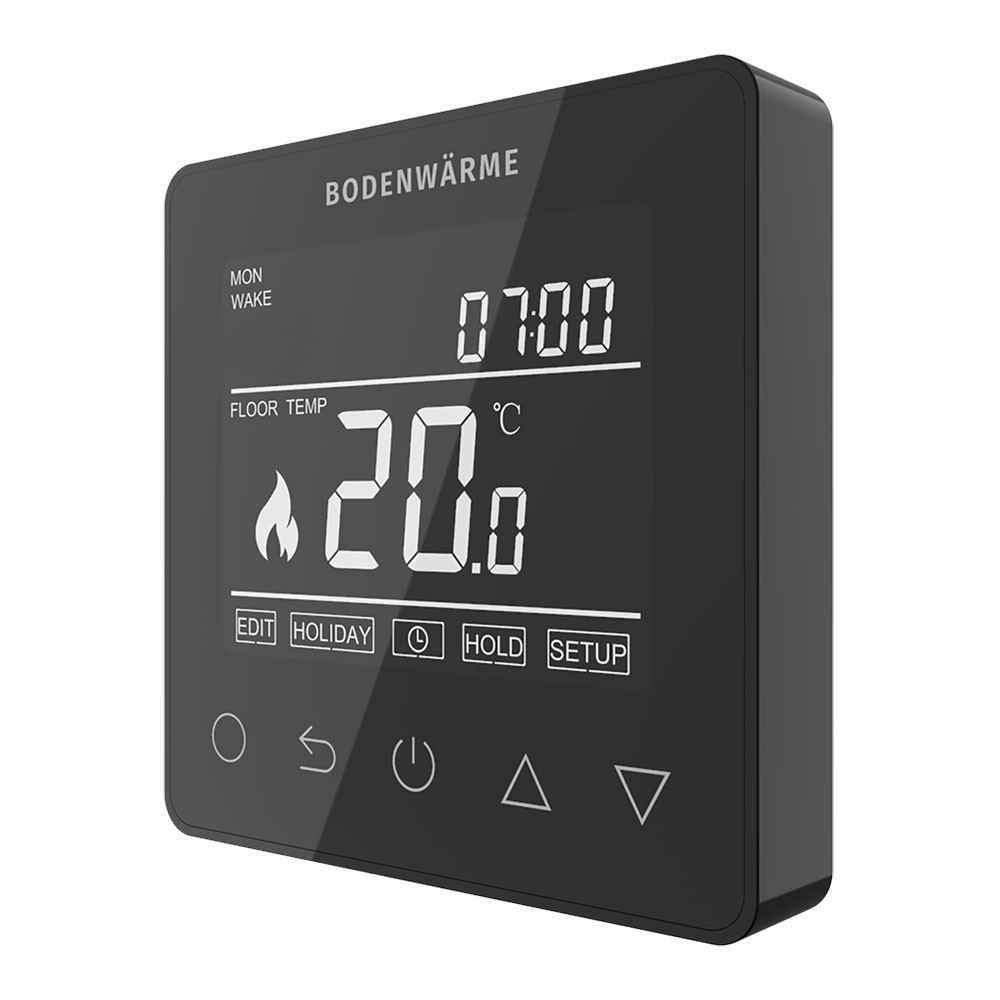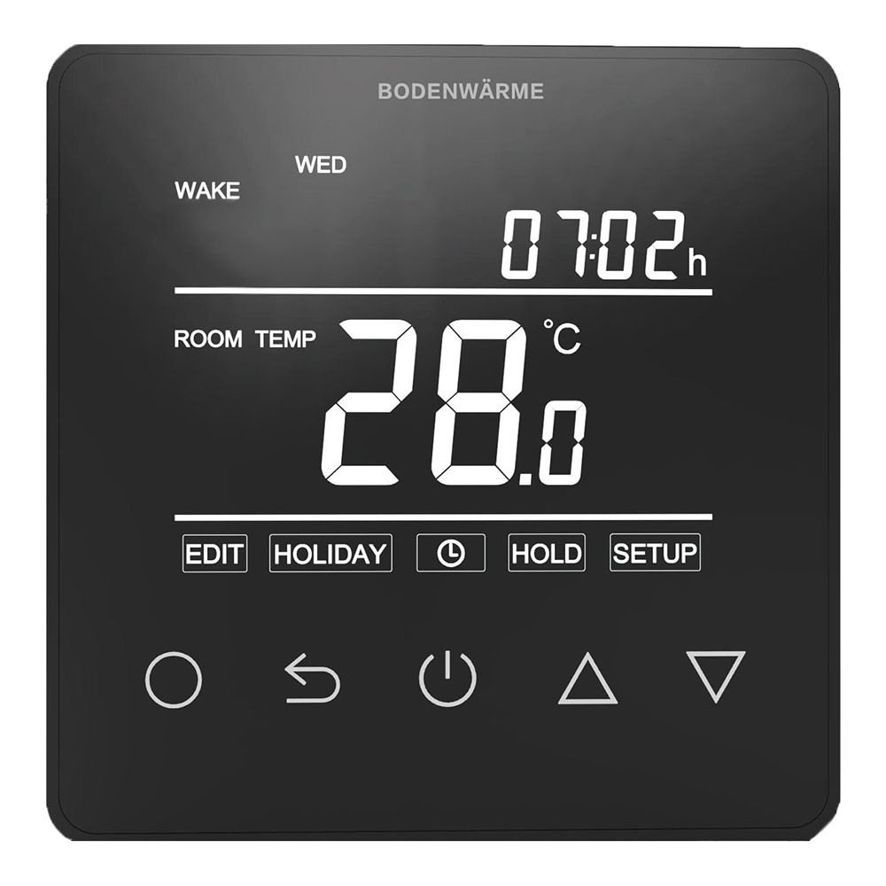 The dSTAT thermostat, with its sleek black finish, features a touchscreen, adaptive learning, and Key Lock function for security. It allows 7-day programming and holiday mode, giving you full control over your heating schedule. With a single connection point for easy installation, this discreet, durable system seamlessly integrates into your floor for long-lasting, hassle-free warmth.