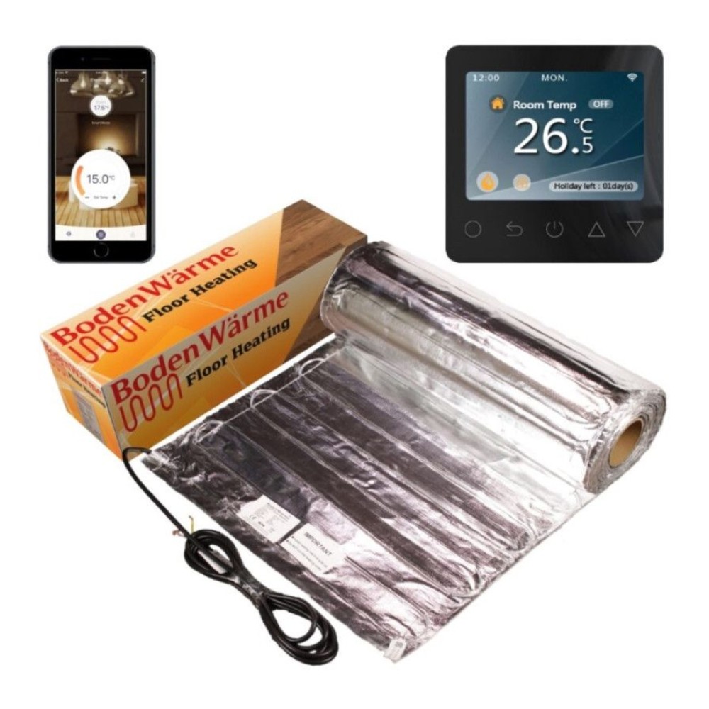 The sleek black thermostat features adaptive learning, everyday programming, key lock, and Wi-Fi connectivity for remote control. The 1mm ultra-thin encapsulated wire minimises floor height increase. And for best performance, you can pair the mats with BodenWärme 5mm XPS underlay insulation or equivalent. Each thermostat controls up to 24m², with larger areas requiring multiple zones.