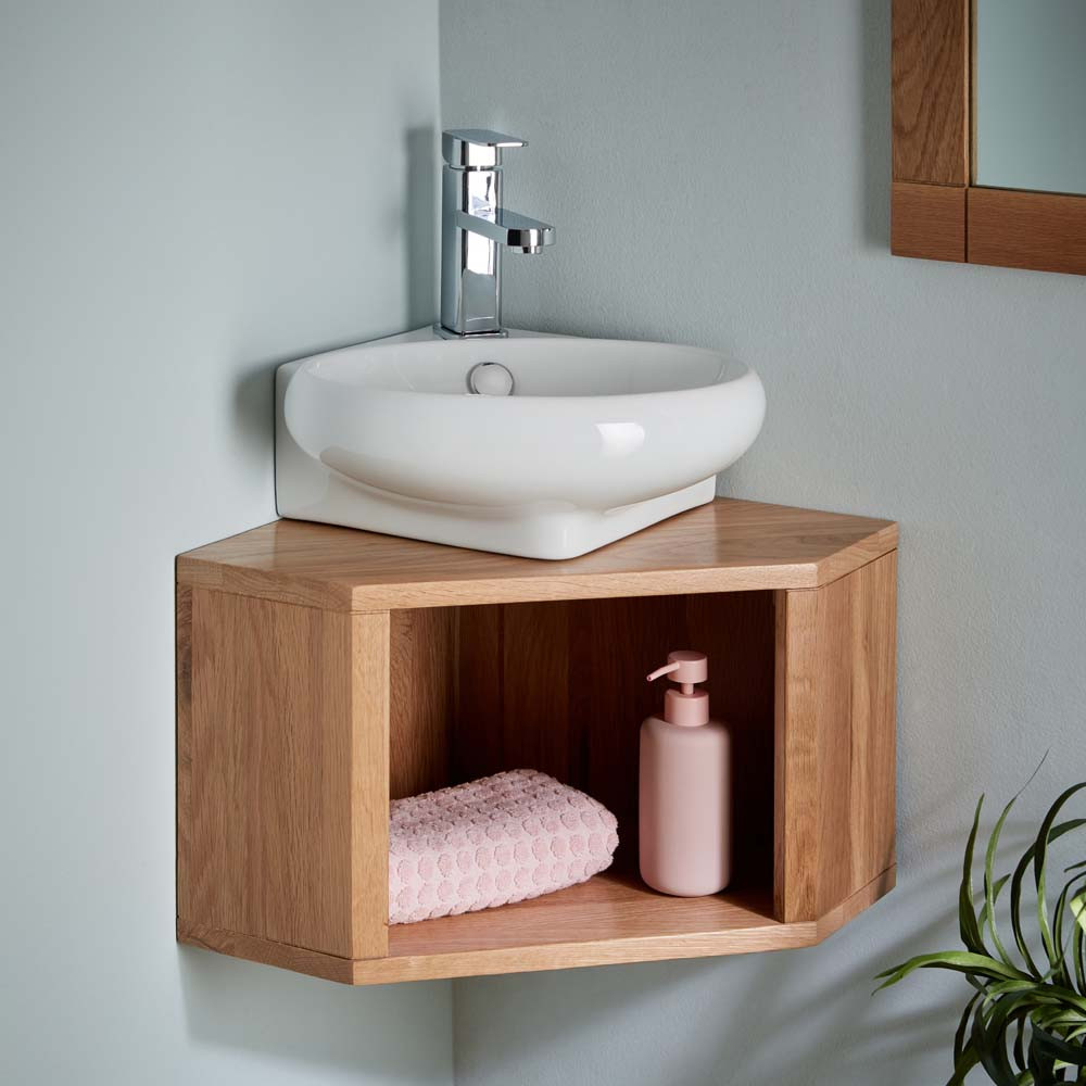 Features & Benefits: Cesena White Ceramic Oval Basin & Dema Corner Oak Shelf
