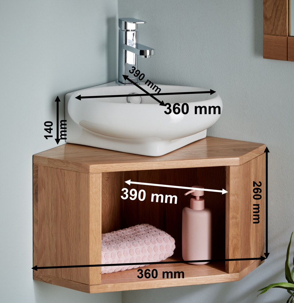 The oak shelf is an excellent space-saving solution designed to utilise the much-wasted bathroom corner which comes with a shelf for extra storage for towels and toiletries. It arrives fully assembled with solid fittings. There is no tap or waste hole drilled to allow you to install these where it works for your bathroom.