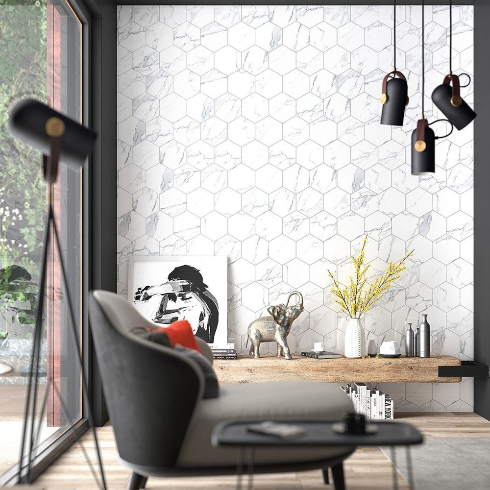 Features & Benefits: Favo White Marble Effect Hexagon Porcelain Wall & Floor Tile - 201mm x 201mm