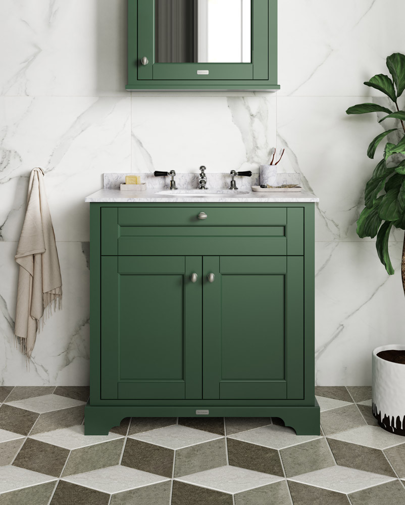 Features & Benefits: Hudson Reed Old London Hunters Green 600mm Free Standing Single Drawer/2-Door Cabinet & 3 Tap Basin