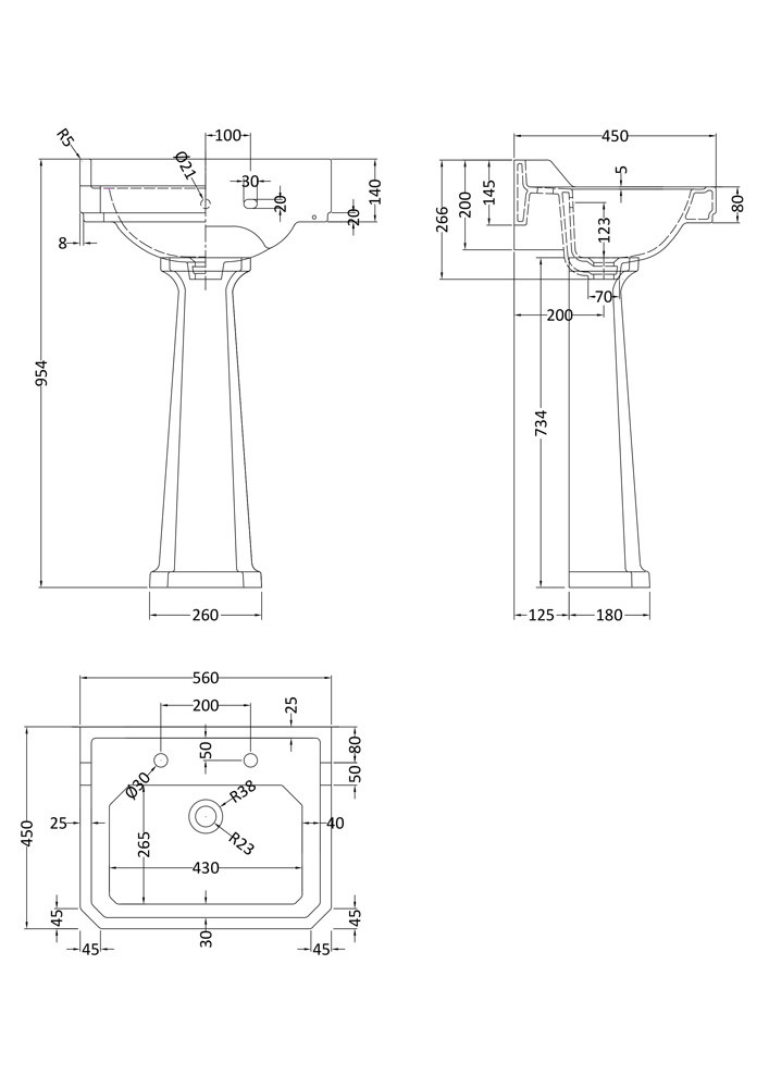 • Full pedestal for a classic aesthetic, with basin overflow cover and splashback