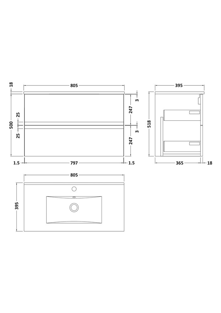 • An excellent space-saving wall hung vanity unit with two sleek handleless drawers for storage