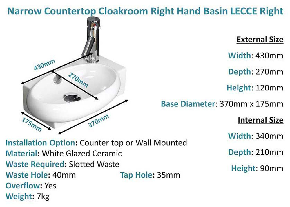 Features & Benefits: Lecce 430mm White Ceramic Right Hand Narrow Oval Countertop Basin | Pallet Deal Qty 8 | £31.39 per Basin inc VAT
