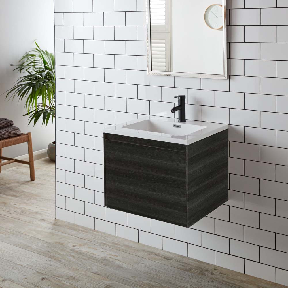A stylish monochrome bathroom set comprising of white gloss and dark, black finishes, the Loft 60 Dark Oak Black Cabinet & Resin Gloss Basin with Matt Black Mixer Tap & Waste is a fantastic space-saving solution that combines a wash basin with much-needed bathroom storage space.