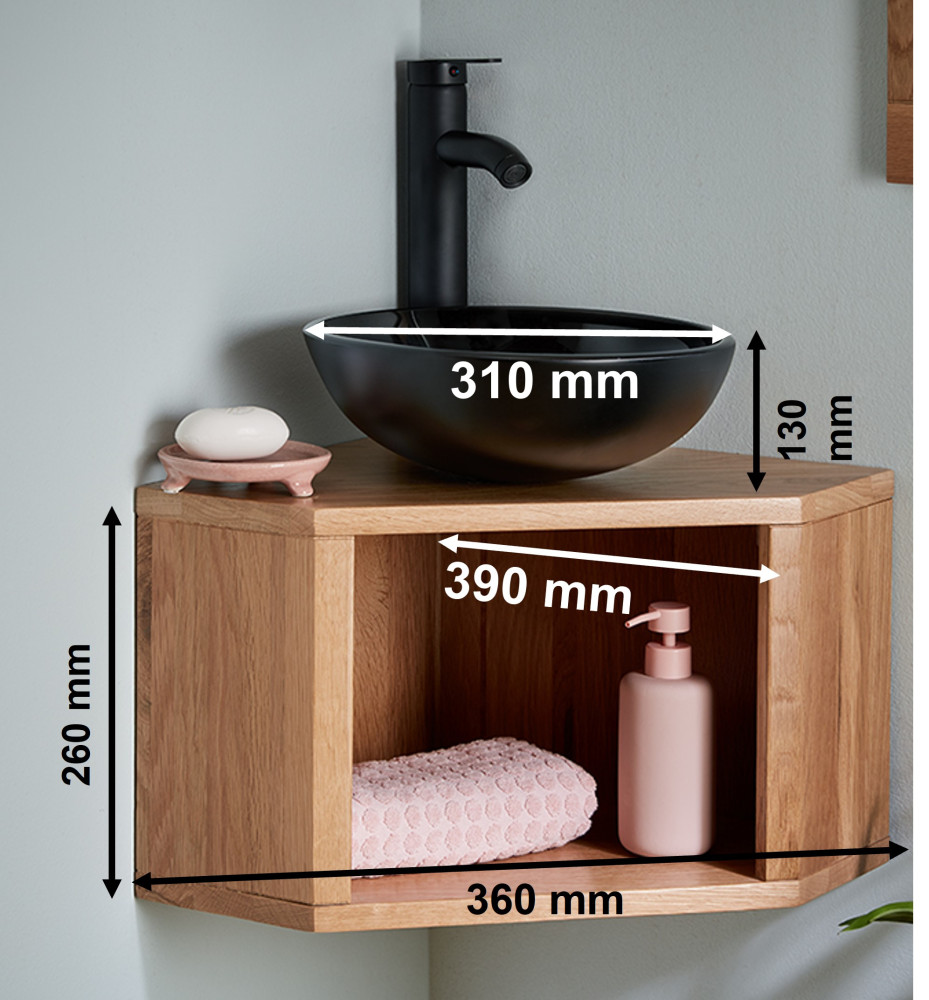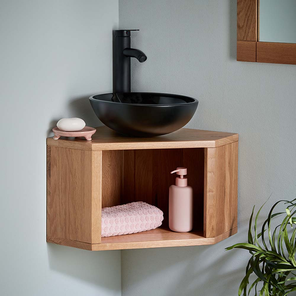 The rustic-looking oak shelf is an excellent space-saving solution designed to utilise the much-wasted bathroom corner which comes with a shelf for extra storage for towels and toiletries. The shelf arrives fully assembled with solid fittings. There is no tap or waste hole drilled to allow you to install these where it works for your bathroom.