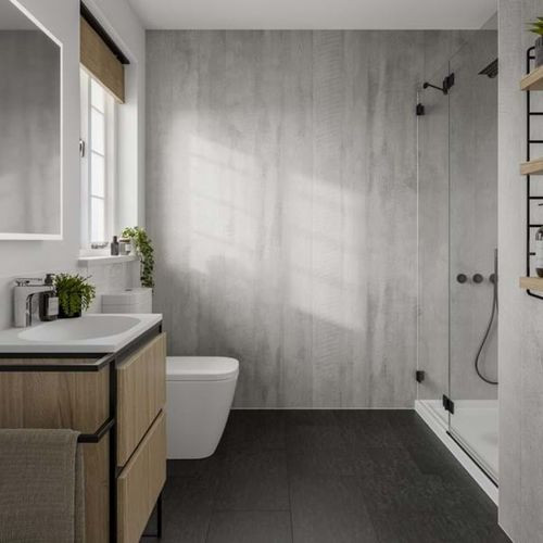 Embracing a chic design inspired by weathered timber planks, the Multipanel Linda Barker Concrete Elements Unlipped Shower Wall Panel boasts a textured surface reminiscent of concrete, bringing both durability and aesthetic appeal to your bathroom space.