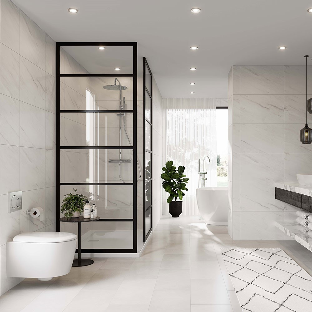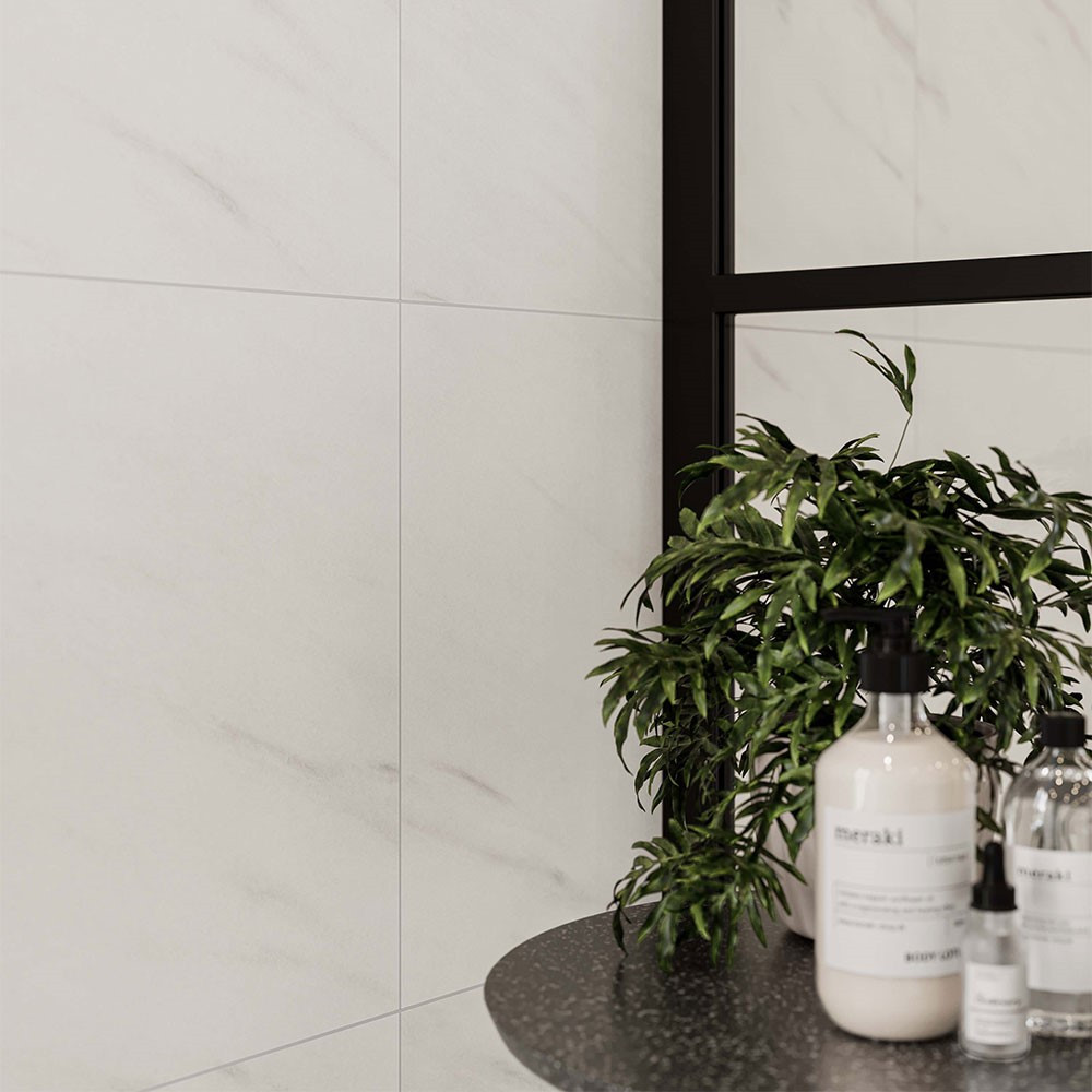 The panel tile-effect pattern is perfect for creating the illusion of depth and open space, making it an ideal choice for big and small bathrooms alike. The panels in this collection look and feel like genuine ceramic tiles, with a purely decorative grout line that requires no maintenance but still evokes that classic and timeless look. Backed by a 30-year warranty.