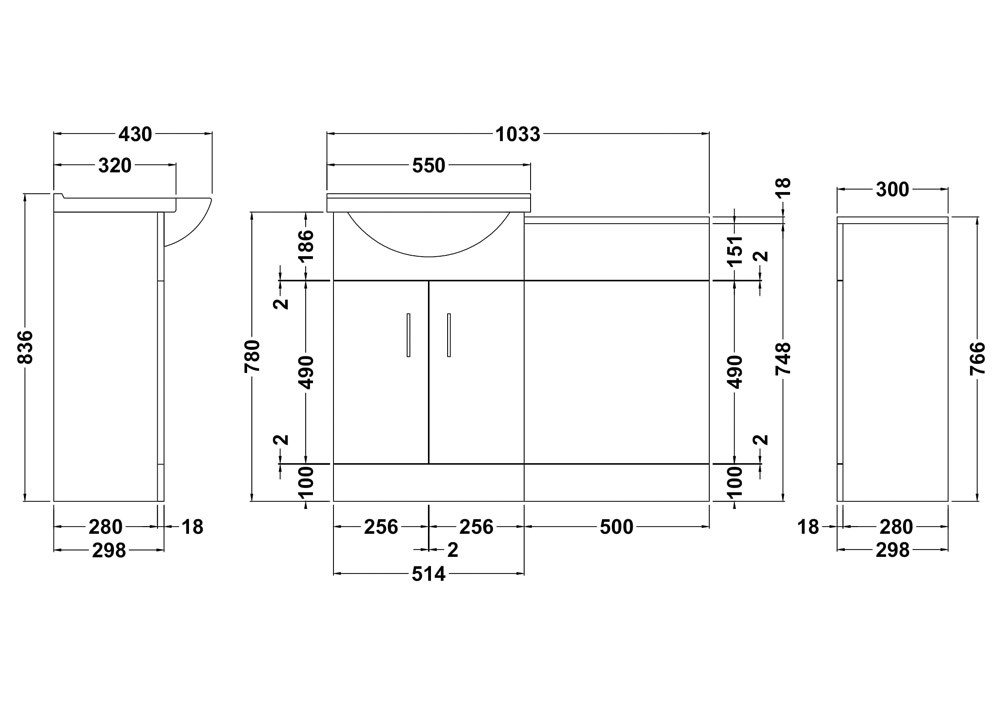 • 836mm combined height x 1033mm combined width x 430mm combined depth