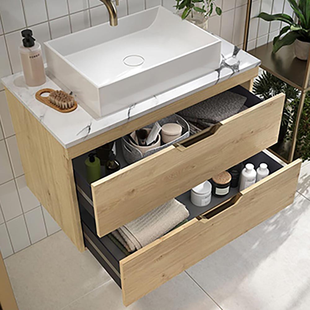 Make a bold statement with the Aubrey Wall Hung Vanity Unit in a Davos Oak Finish, a centrepiece that blends minimalist design with a premium feel. Part of Ideal Bathroom's striking new Aubrey collection, this vanity features a distinctive, angular integral handle design that adds a modern, architectural touch. The warm oak unit exudes natural texture and a calming tone, bringing a sense of balance and elegance to your bathroom space.