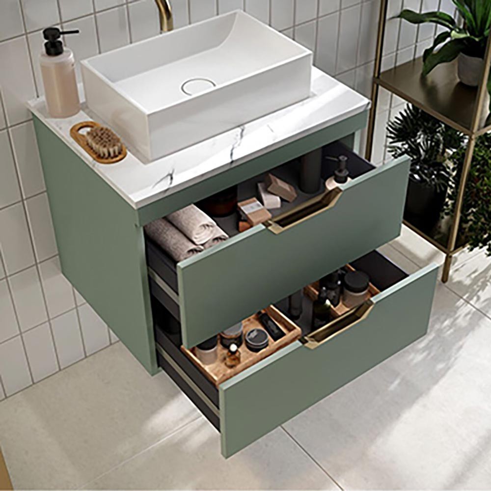 Features & Benefits: Scudo Aubrey 500mm x 440mm 2-Drawer Wall Hung Reed Green Vanity Unit