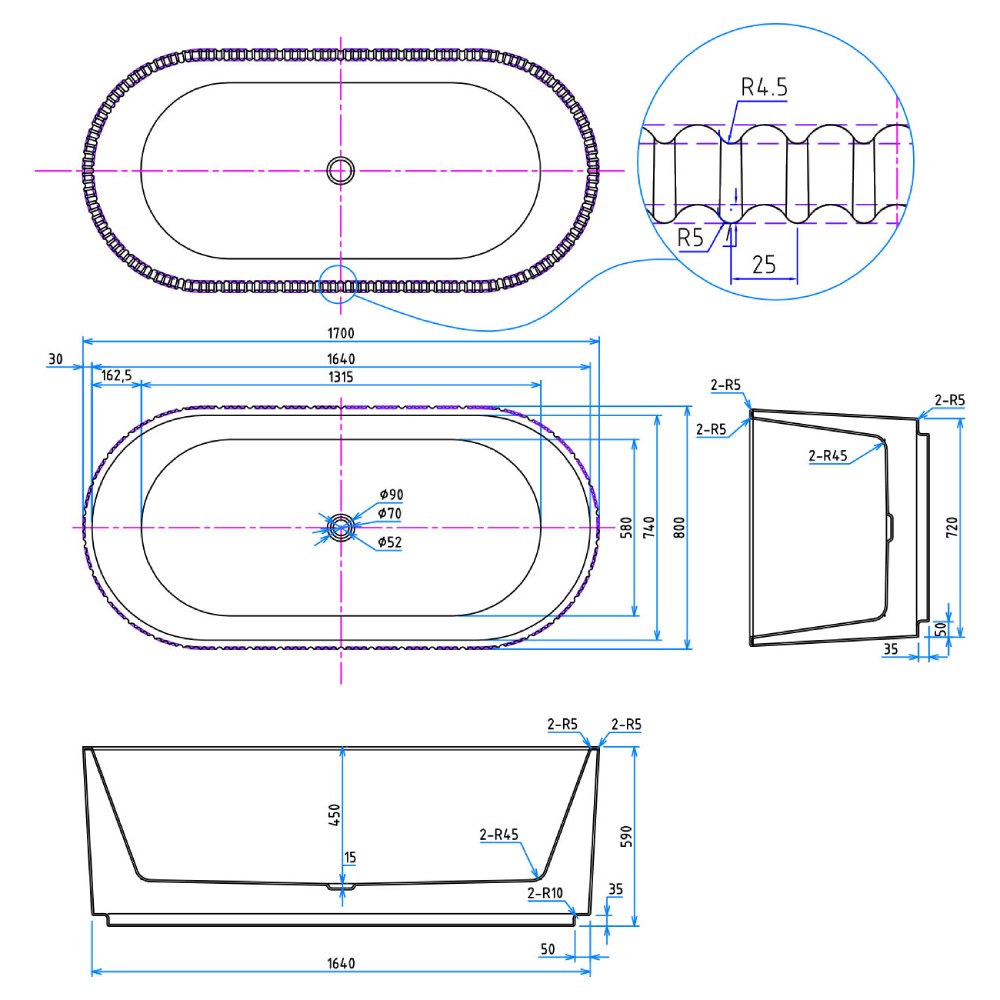 Features & Benefits: Scudo Labyrinth Fluted Freestanding Bath White - 1700mm x 800mm
