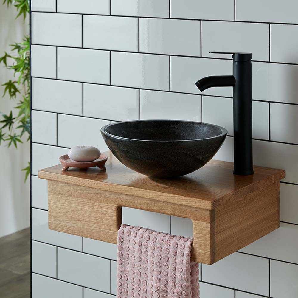 The charming, rustic-looking rectangular oak shelf provides much-needed storage space for toiletries. It also comes with a clever cut-out section for a towel, so you don't have to install a separate handrail. No tap or waste hole is pre-drilled, so you can install these wherever it works best for your bathroom.